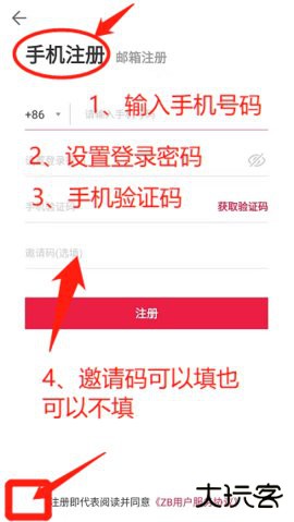 2、在注册账户界面,输入手机号码与密码,获取并输入手机验证码,点击“注册”。注册即代表阅读并同意《ZB用户服务协议》