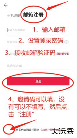 1、在注册账户界面,点击“邮箱注册”输入邮箱地址与密码,登录邮箱获取验证码并输入,点击“注册”。注册即代表阅读并同意《ZB用户服务协议》