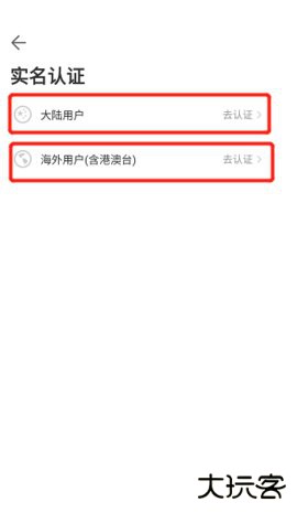 3、在“实名认证”界面,选择大陆用户/海外用户(含港澳台)。