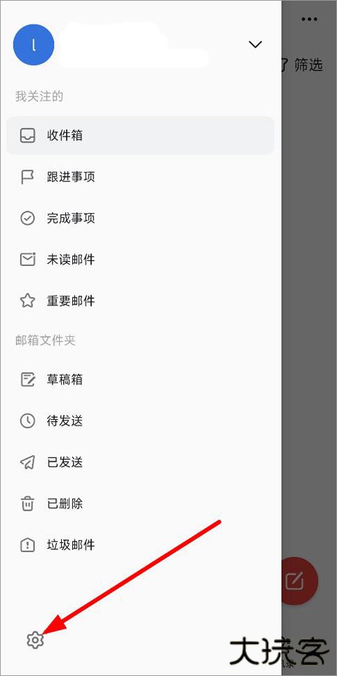 2、打开收件箱后可以看到我关注的收件箱、跟进事项、完成事项、重要邮件、草稿箱等,点击左下角的设置图标;