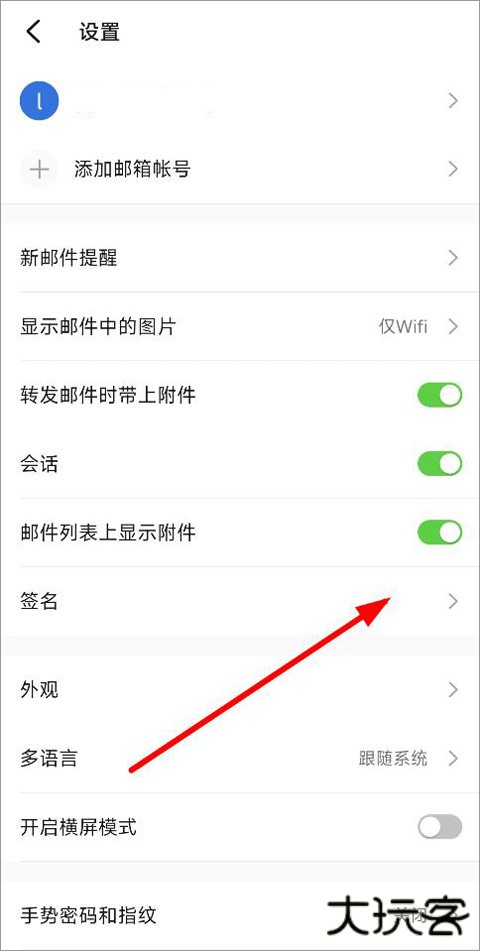 3、打开设置页面后,可以看到邮箱账号、新邮件提醒、显示邮件图片、会话等,点击签名设置;