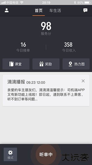 2、系统会帮你听单,其实就是在筛选合适的给你派单,这时候你可以看到你今天出单情况,收入情况,你的服务分有多少,还能看一些系统消息。