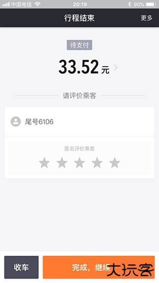 12、所有流程结束后,你可以看到你收款的支付情况,待支付还是已支付,还可匿名评价乘客,如果你想继续接单就点击完成继续接单,如果你今天不想跑了,那就点击收车,系统就不会给你派单了。