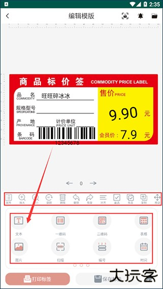 4、根据商品的要求编辑标签,用户可自定义添加文本、一维码、二维码、编号等信息;