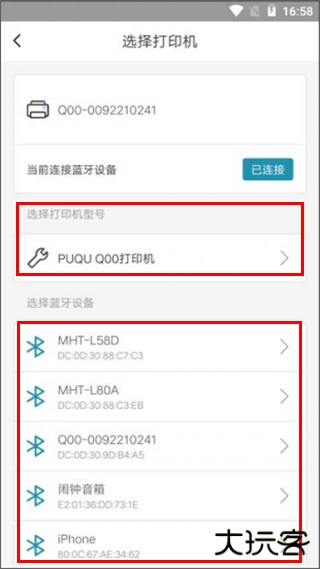2、根据提示开启蓝牙功能,选择打印机型号,搜索打印机设备进行连接,成功连接时会显示“已连接”;