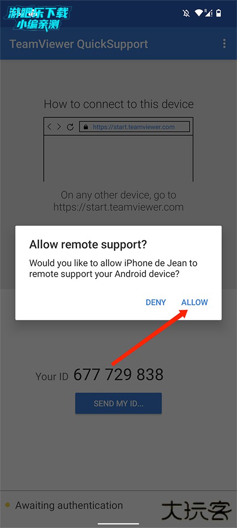 2、在被控制端的手机上会弹出一个远程控制确认,选择“ALLOW/允许”选项,