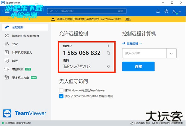 1、打开电脑端TeamViewer,查看并记住ID号和密码,