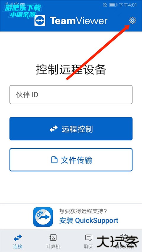 1、打开远程控制软件teamviewer手机版,选择右上角“齿轮”图标,