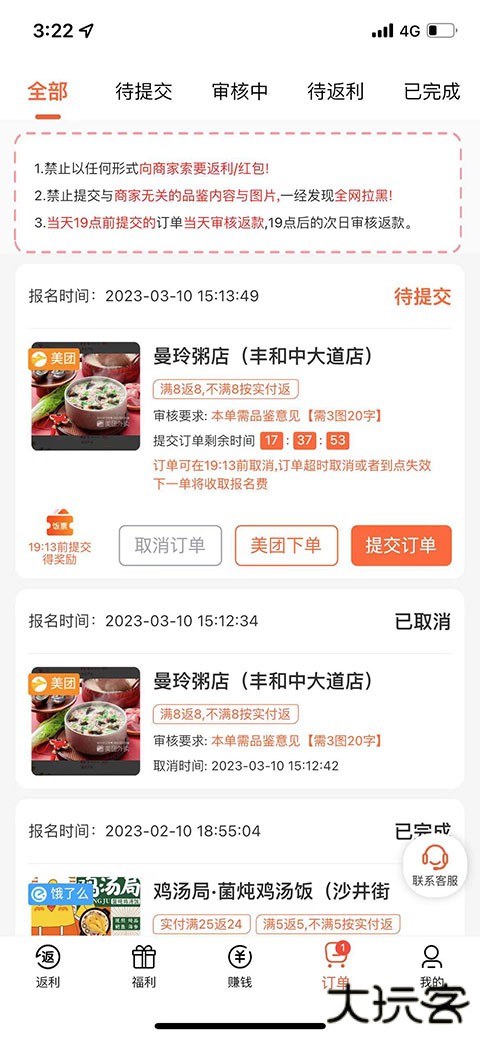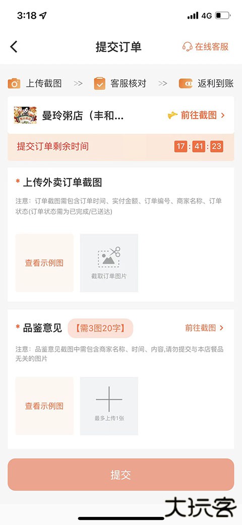 4、订单送达后才能提交订单获取返现,里面外卖一般有两步返现条件,第一步上传外卖订单截图,第二步上传用户评价。然后等审核完成就可以收到返现了。