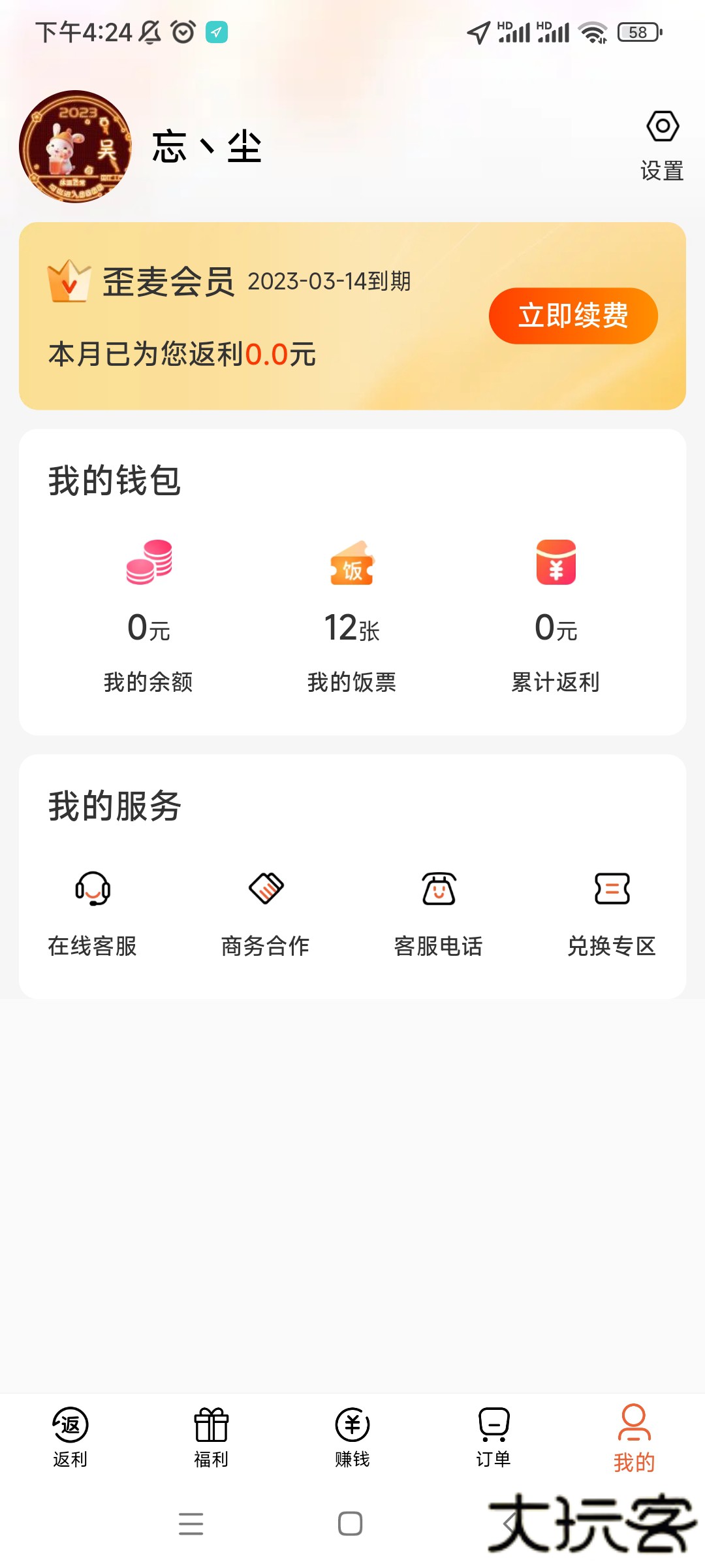 1、登录歪麦霸王餐app,点击饭票,可查看当前有多少张饭票