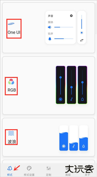 1、安装完成打开后,选择最下面的样式设置,可以看到各式各样系统的音量调整画面