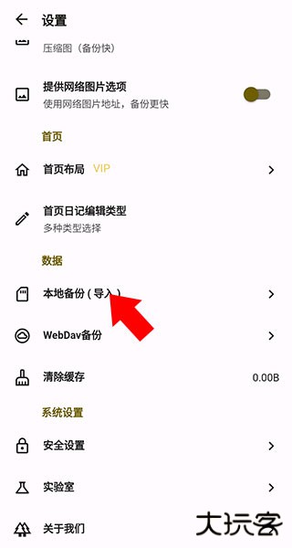 2、进入“设置”界面后,滑至地段,点击本地备份(导入选项);