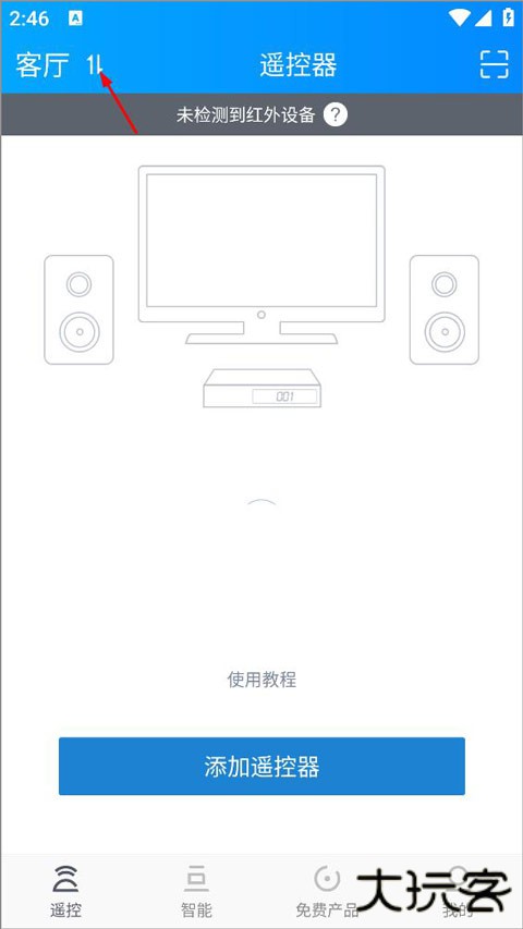 1、用户打开遥控精灵app,进入遥控主页,用户可点击左上角切换遥控房间;