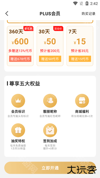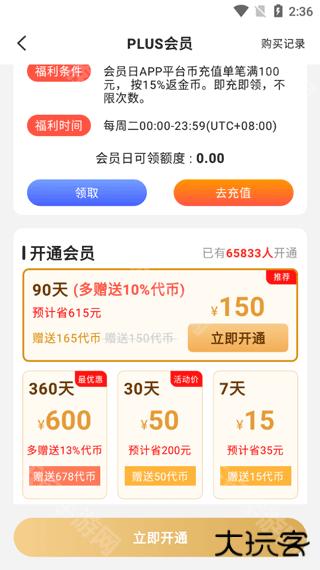 360天会员有效期为360天,开通当天立即赠送678代币,每天可领取5代币(含开卡当天);