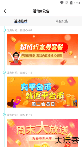 7、点进活动公告,可以看到有活动推荐以及停服公告,在活动推荐里可以看到软件推出的优惠活动,在停服公告里可以查看各个游戏的停服公告具体内容。
