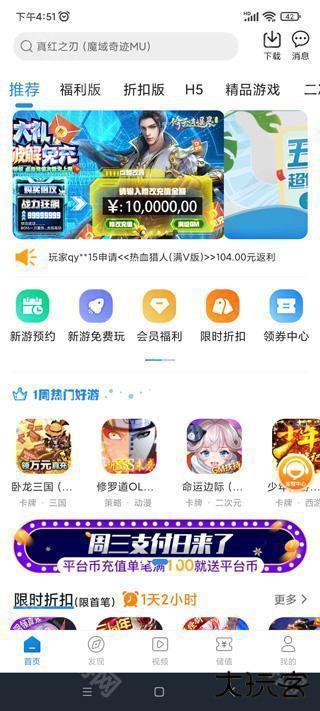 2、进入软件后,在首页可以看到由推荐、福利版、折扣版、H5、精品游戏等,还有各种新游预约等。