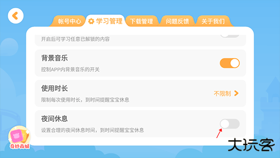 3、点击“学习管理”,滑到最下方,点击右侧的开关,即可开启夜间休息时间。