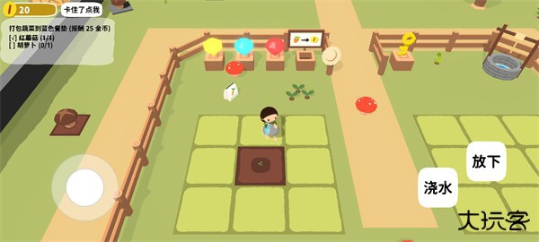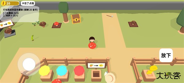 1、进入游戏如图,玩家首先需要根据左上方任务提示,拾取一个红蘑菇到蓝色桌垫上