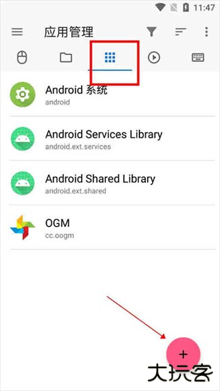 4、上方选项栏点至应用,右下角+号安装应用,选择手机中提前下载好的apk;