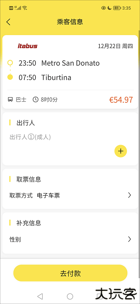 4、最后,在这里看清楚乘客信息,添加好出行人、取票方式、补充信息后就可以点击去付款了。