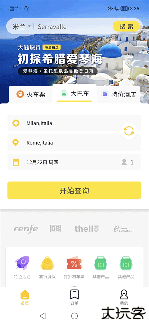 1、首先,打开软件,在首页找到并点击“火车票”或“大巴车”然后点击“开始查询”按键;