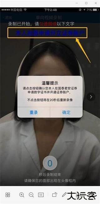 7、最后录制视频,保持平视镜头,倒计时结束时念“本人自愿申请开立证券账户”