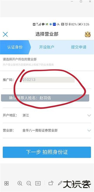 2、输入手机号验证码、工号/推广码,选择您要开户的地区和开户营业部。例如(开户地区:浙江营业部:金华八一南街证券营业部)