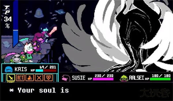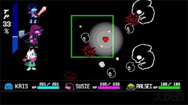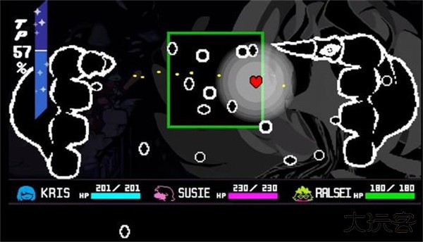 5、当第一次击败boss后boss会进入恢复阶段,这个阶段可以随便打,boss不会掉血,等boss恢复完毕后会进入剧情,剧情结束后会绿龟先生会加入战斗,此时需要将Kris扔进泰坦中心位置就可以进入剧情结束战斗。