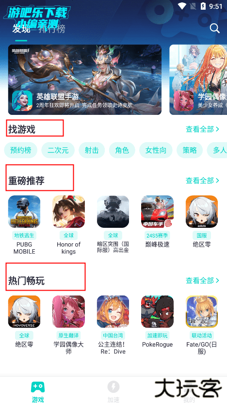 2、进入后,可以在首页看到很多游戏,分别有找游戏、重磅推荐、热门畅玩等栏目,如点击pubg;