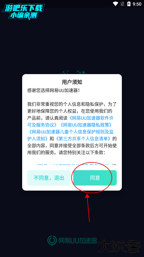 1、首次安装进入uu加速器时,会弹出用户须知,可耐心查看后,点击同意;