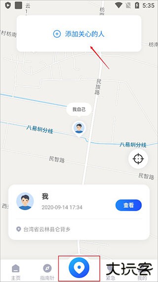 4、点击中间的定位,上方添加关心的人,即可看到你与对方的距离;