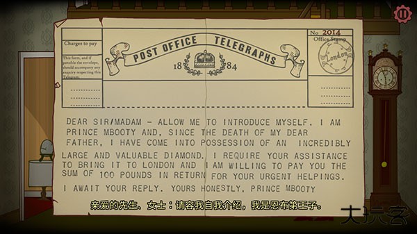 4、查看左侧的电报,然后……,翻到最后一封,得知亚斯威伯爵有请,出房门。