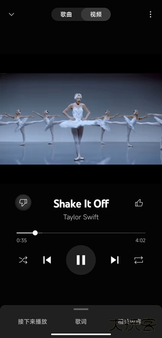 6、在歌曲的页面还可以观看本首歌的视频,并且下面还有一些其他选择,如:接下来播放、歌词、相关内容。