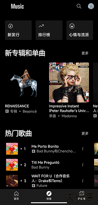 3、在软件首页,可以看到:新发行、排行榜以及心情与流派分类。
