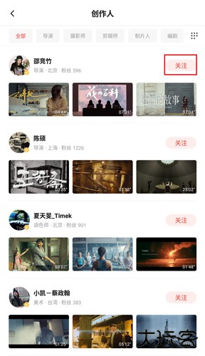 2、你就可以看到很多创作人,对某个创作人感兴趣的就在ta右侧进行点击“关注”按钮;