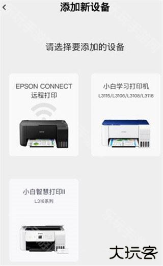 2、点击【暂无设备,前往绑定】,选择要添加的设备,目前仅支持EPSON、小白学习打印机、小白智慧打印II。