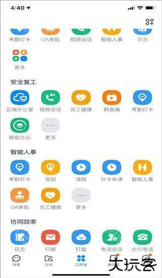 3、在工作台中有着考勤打卡、oa审批、视频会议、智能人事、日志、云端办公室、员工健康、群直播、考勤打卡、智能办公、签到、请假、补卡申请、钉邮、电话会议、办公电话等功能: