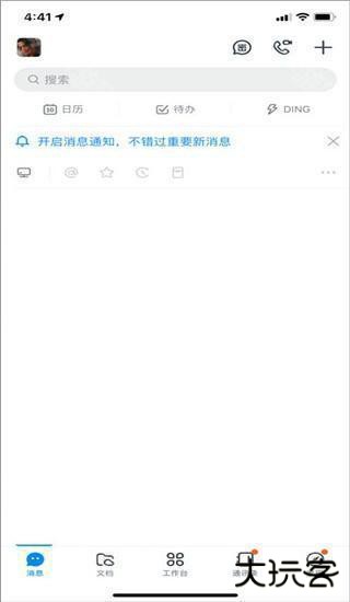 1、在萌爪软件园下载安装钉钉app,同时运行软件会看到消息、文档、工作台、通讯录、发现五个板块,在消息里有着日历、待办、ding、最近联系人等功能: