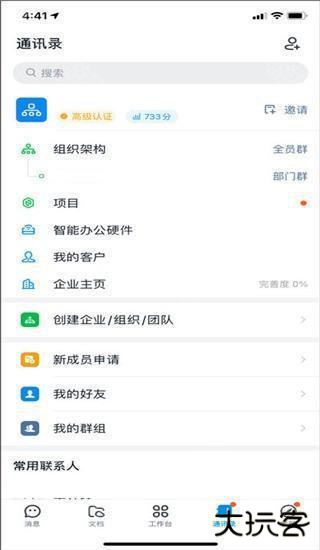 4、在通讯录中有着组织架构、智能办公硬件、企业主页、创建企业/组织/团队、我的好友、我的群组、常用联系人等功能: