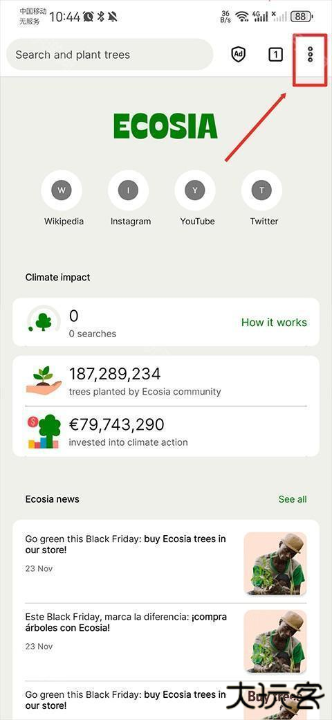 1、下载并安装Ecosia浏览器,完成后打开软件,点击右上角的菜单选项。