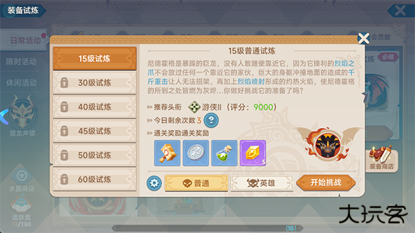 分为普通难度和英雄难度,每日5次,建议只打英雄难度,会有更高概率掉落高品质装备,从40级试炼开始,将会掉落磨牙之龙道具以兑换传说级装备。