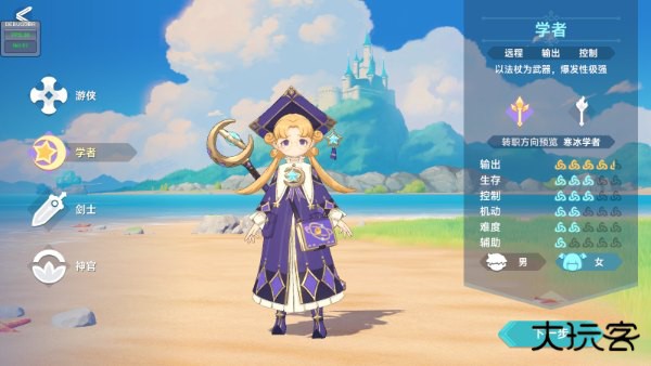 学者:远程法术输出职业。以法杖为武器,拥有高的持续输出能力。上手难度:2颗星。